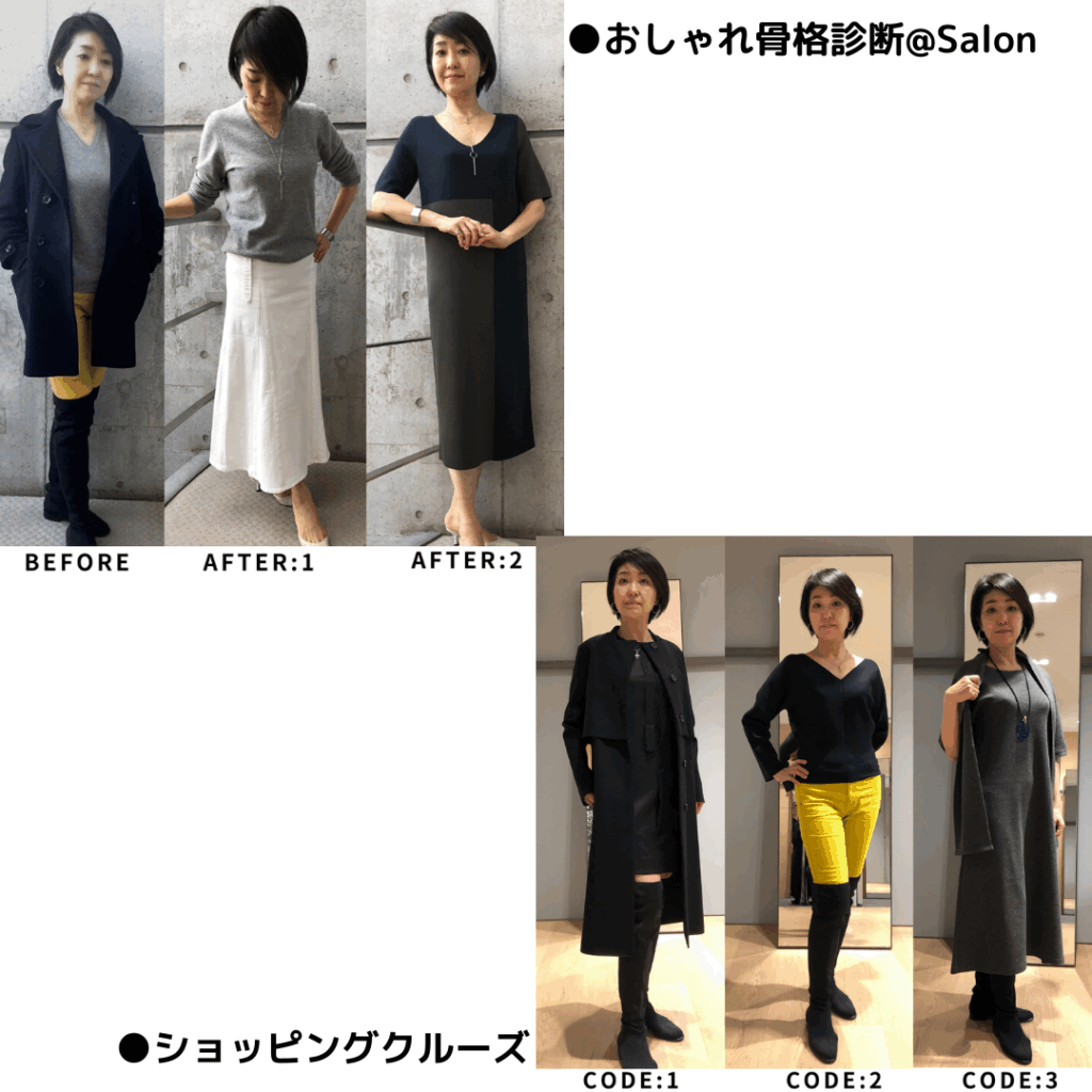 私は柔らかい素材感のある物が苦手、ざっくりしたニットも苦手と教わり、洋服選びは色だけではなく、身体で装い、生地感と肩まわり腰回り脚の様子で着こなす事を知る大切さを初めて学びました。